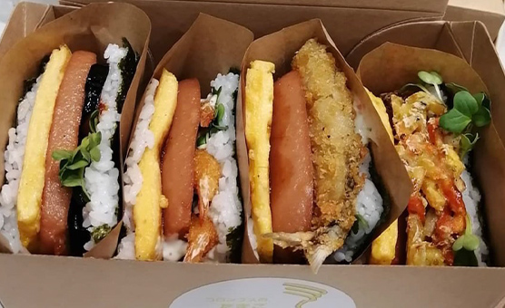 ソウルフードのベビーハムと様々な具材をギュッと欲張りにご飯でサンドした新感覚なおにぎりです。